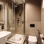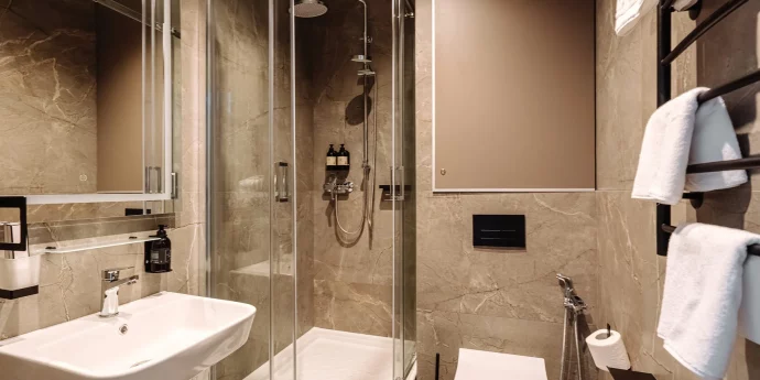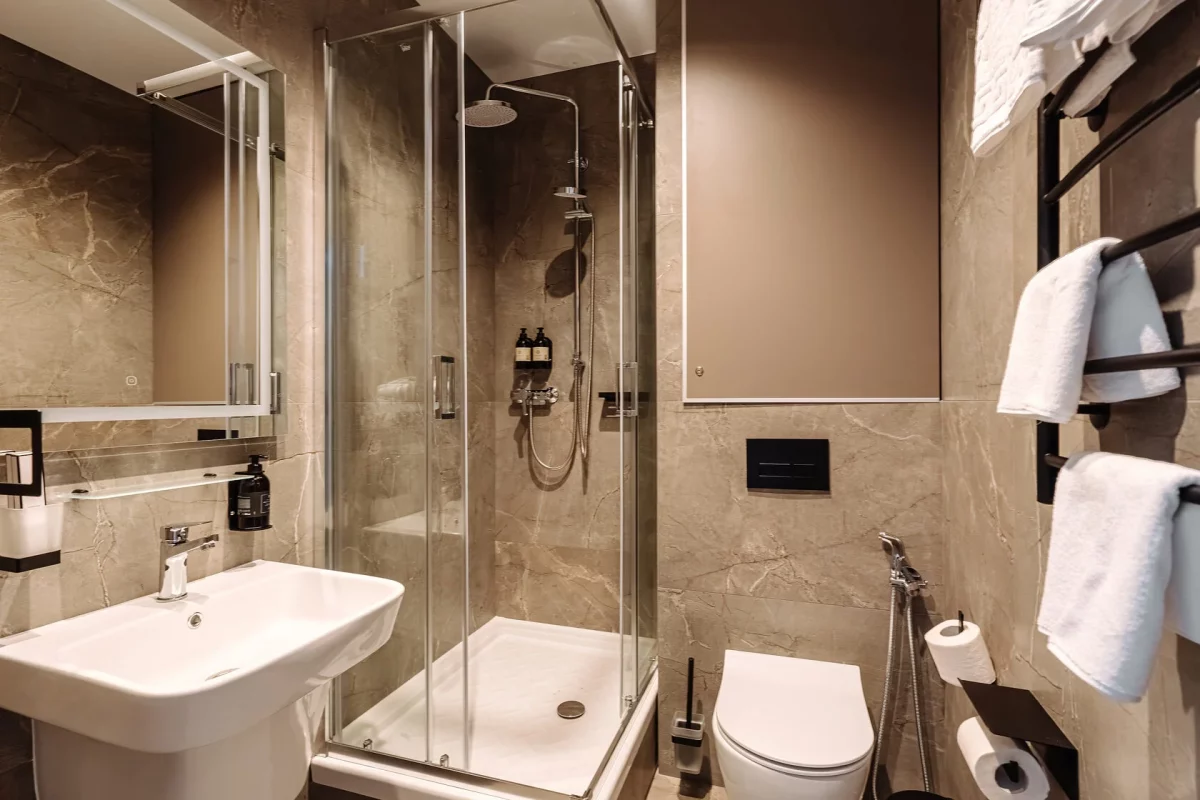 Ванная комната оснащена душевой зоной, зеркалом с подсветкой и системой тёплого пола.