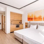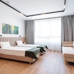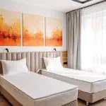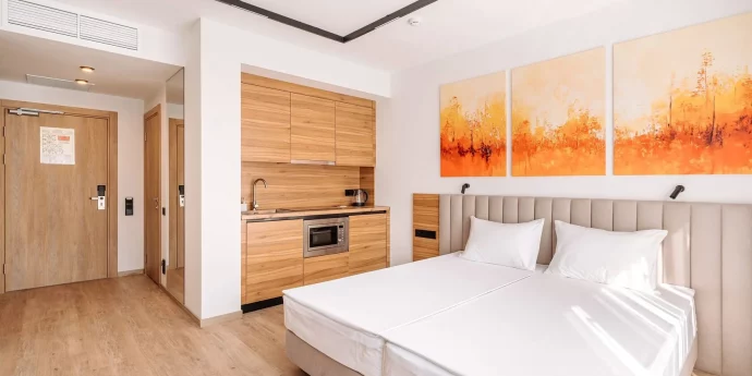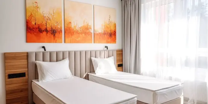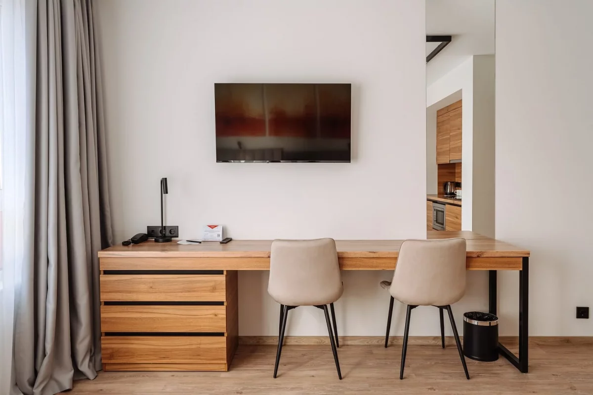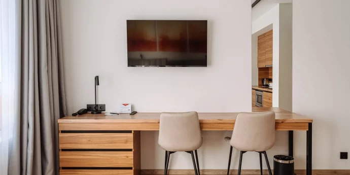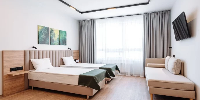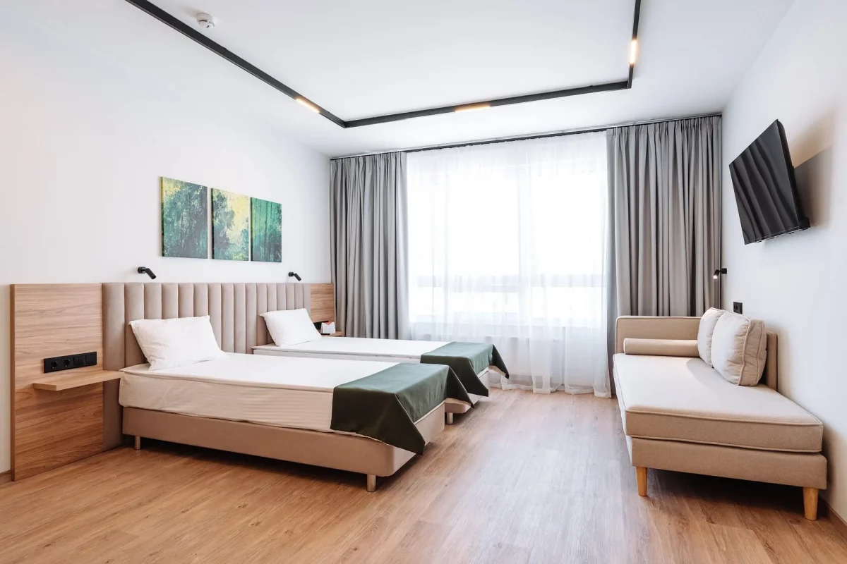 В номерах есть всё необходимое для комфортного отдыха: удобные модульные кровати, вместительный шкаф, рабочая зона, большая ТВ-панель, кондиционер и сейф.