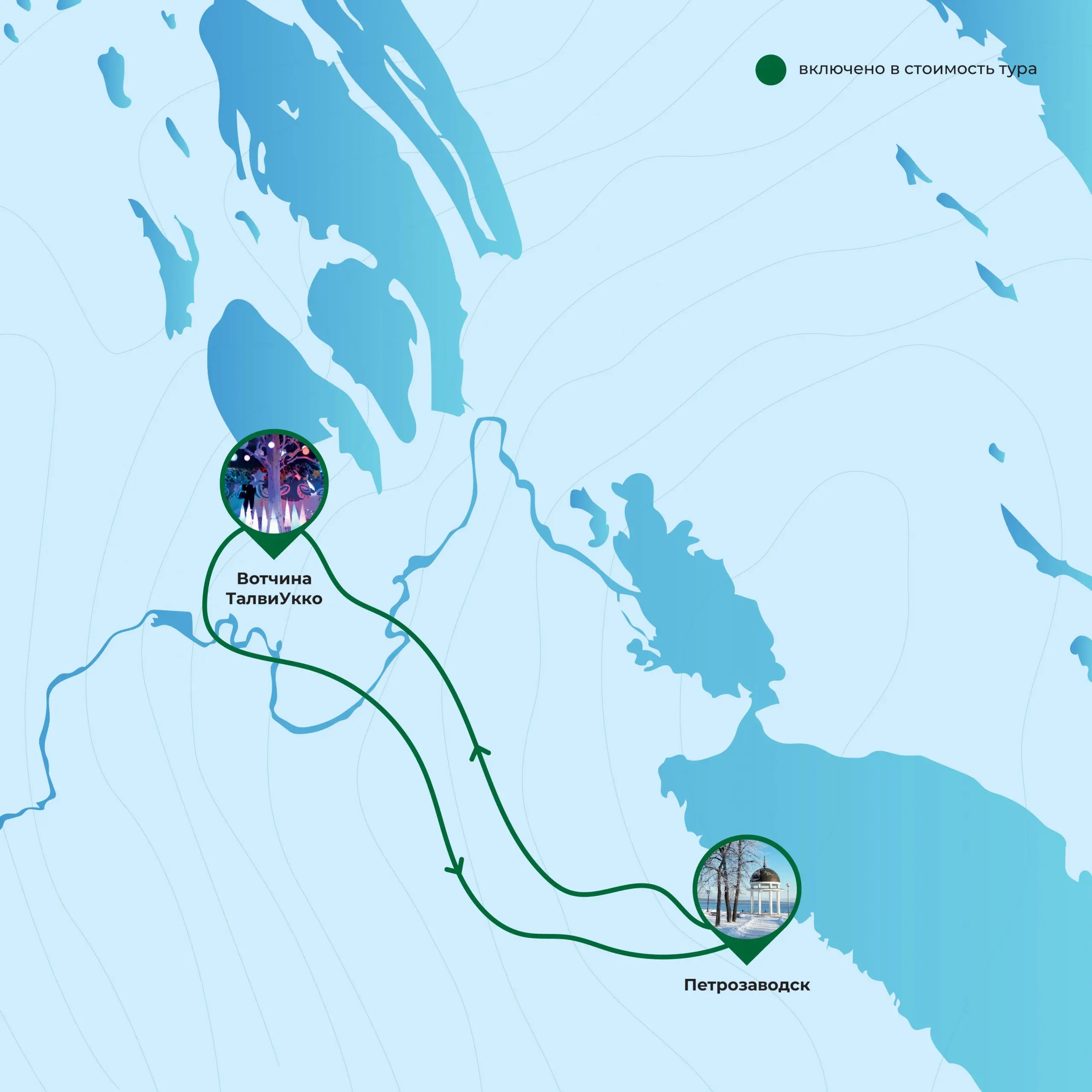У вас будет возможность посетить питомник хаски, полюбоваться северными оленями и подворьем домашних животных. А после катания на упряжке вас ждет ароматный карельский чай.