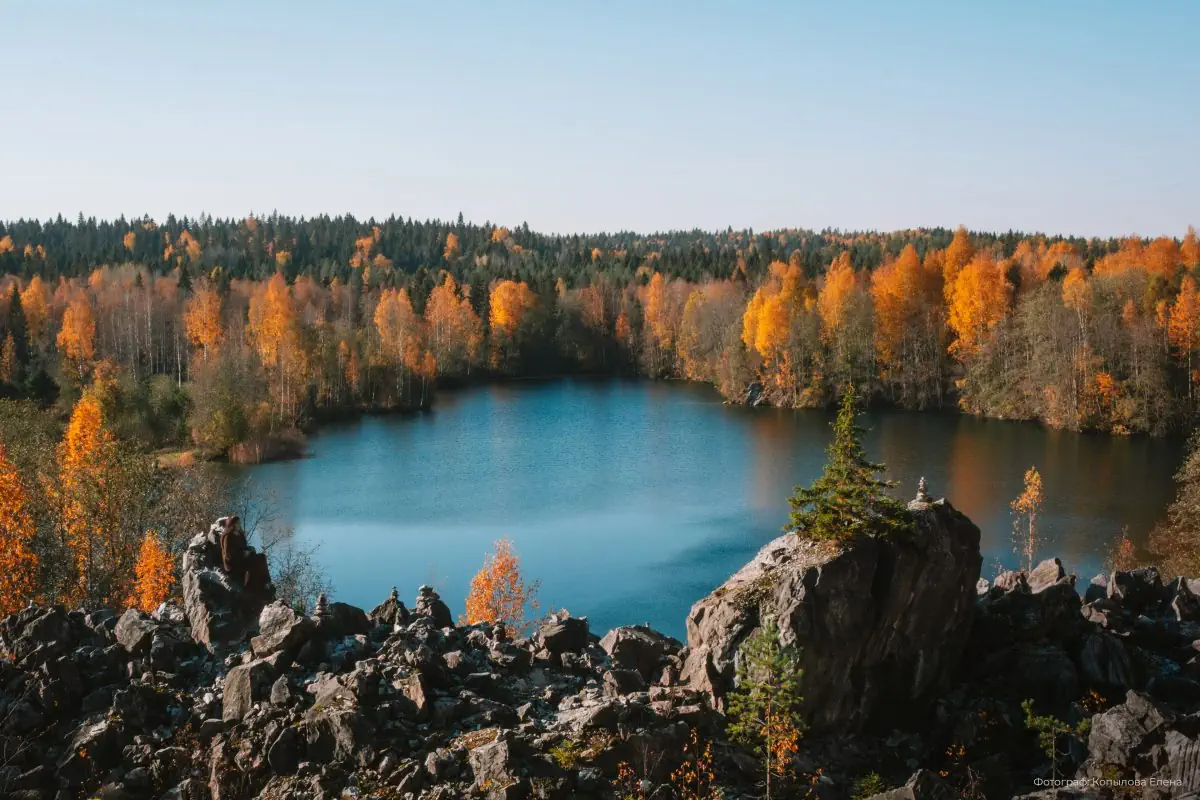 Осенью сюда стоит приехать специально, чтобы увидеть парк совсем в другой палитре. Желто-красные, словно горящие, деревья вокруг Мраморного карьера создают невероятный контраст с бирюзовой водой озера. Можно бесконечно стоять над обрывом и любоваться игрой этих потрясающих красок природы.
