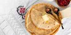 Богатое угощение: серые щи, картофель отварной, разносол (грибы соленые, капуста квашеная, огурцы маринованные), блины, сметана, ватрушки с творогом и вареньем, чай на травах, деревенская наливка.