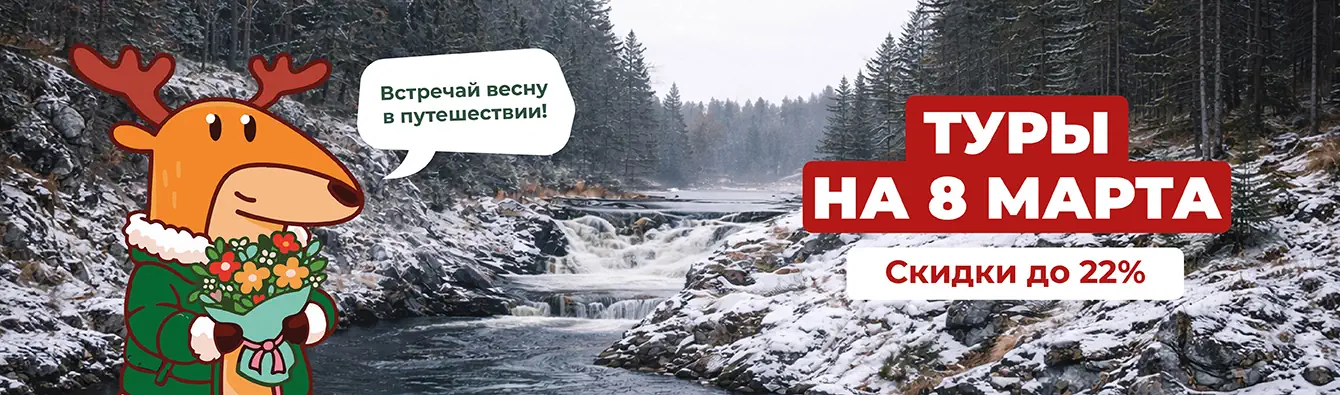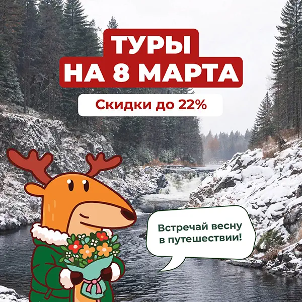 Праздничный тур выходного дня на 8 марта — отличный повод отправиться в небольшое путешествие на 3 дня и сменить обстановку. В программе — Карелия с ее зимними пейзажами и мраморными каньонами, а также туры в Питер с прогулками по историческому центру и посещением музеев.