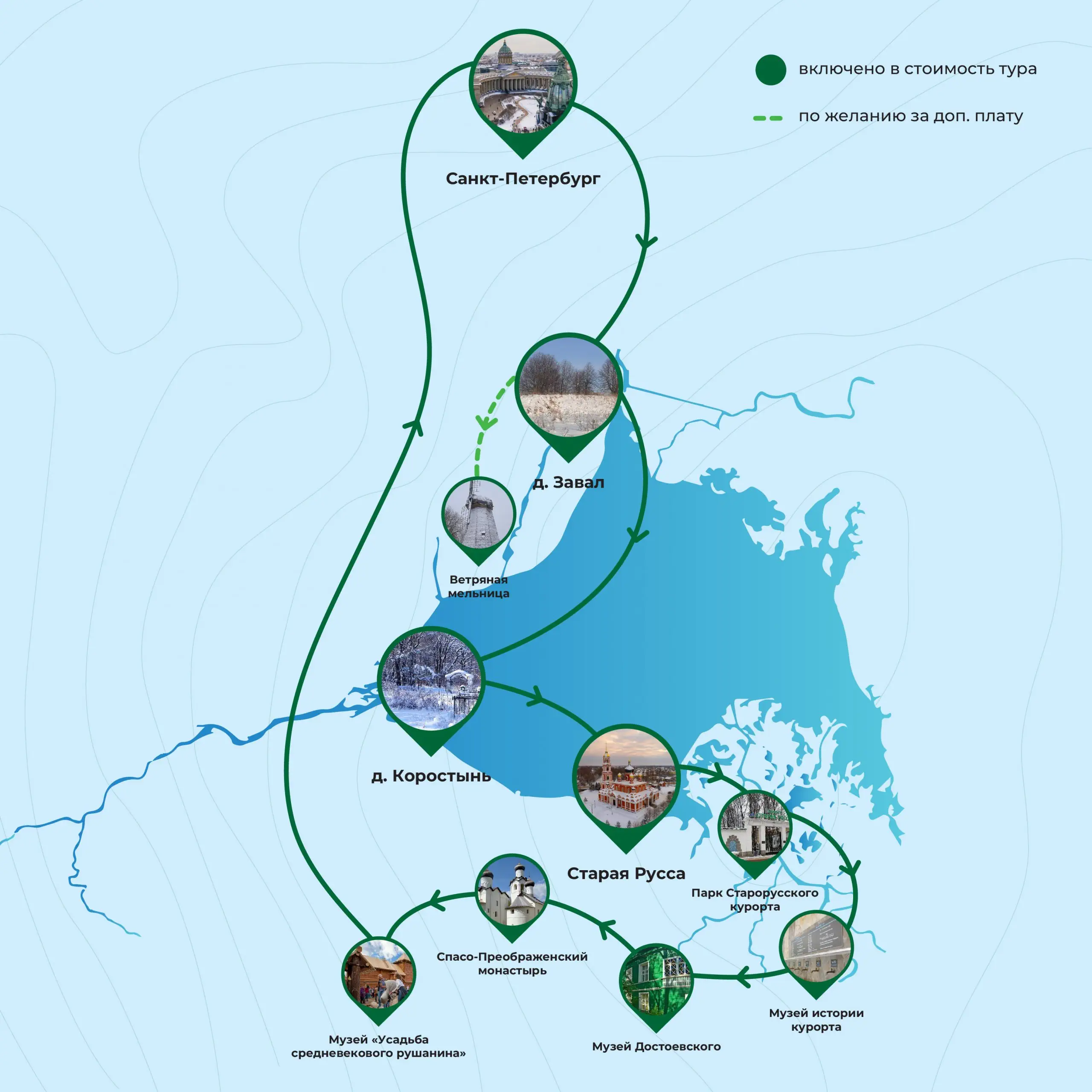 1-й день: Санкт-Петербург – переезд в деревню Завал – ветряная мельница (экскурсия по желанию за доп. плату) – переезд в Коростынь – осмотр достопримечательностей – переезд в Старую Руссу – парк Старорусского курорта – музей истории курорта